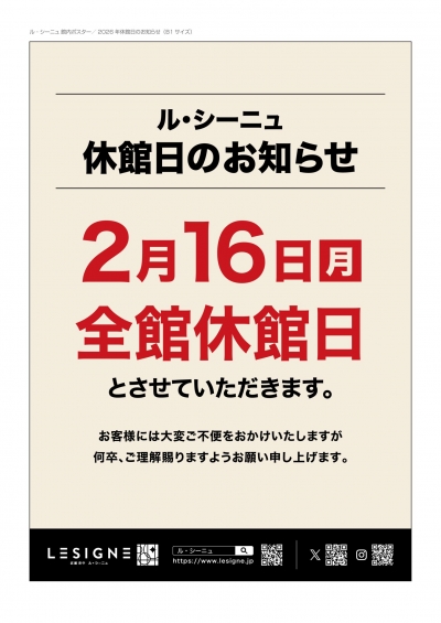 2026年2月16日 全館(ル・シーニュ) 電気設備年次点検のため、和光も休館となります。